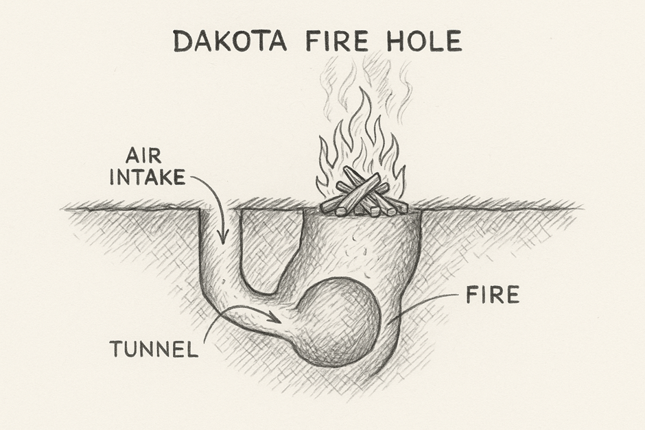 “Bingo, that’s right. First, dig two small pits in the ground, not too far apart—a gap of twenty to thirty centimeters is enough. Then dig, dig, dig at an angle to connect the two holes. The underground part will look like a ‘V’ shape. Keep one hole clear for air intake and smoke exhaust, and place the firewood inside the other hole. You can put a grill over it to keep warm and heat things up. The fire burns inside the hole, which is safer than an above-ground campfire. Being sheltered underground ensures the flames burn fully, while also reducing smoke.”