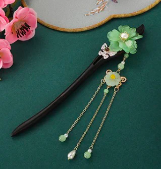 Her glossy black hair was tied back, adorned with an ebony hairpin [發簪 | fā zān | traditional decorative hair accessory] with dark green tassels that swayed gracefully with her movements.